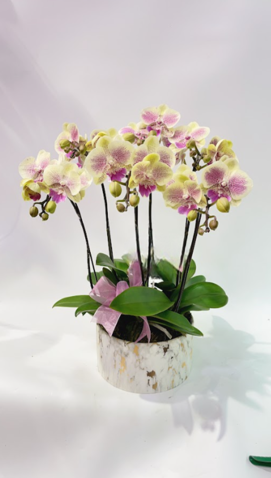 Transform your space with the captivating 6 stem Phalaenopsis orchid arrangement from HK Florist SHOP! These exquisite Chinese orchids feature delicate blooms in a vibrant array of yellow and fuchsia hues, complemented by their lush green foliage. Expertly cultivated by skilled horticulturists, this stunning Phalaenopsis display is designed to ensure exceptional quality and longevity, bringing a radiant and elegant presence to any home or office.