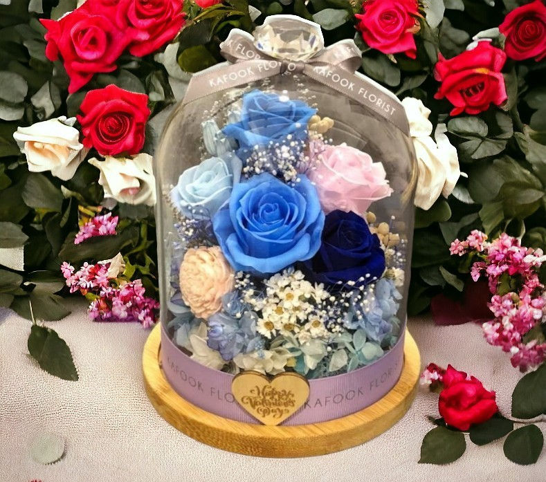 A stunning preserved flower display encased in a glass dome, creating a captivating and long-lasting centerpiece. The arrangement features a variety of blue and pink roses, accented with delicate baby's breath and lush greenery. This elegant and timeless piece makes for a thoughtful gift or a breathtaking addition to any home or office decor. The glass dome helps preserve the flowers, ensuring they maintain their vibrant colors and natural beauty for an extended period.