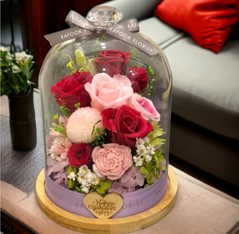 A mesmerizing display of preserved red and pink roses, surrounded by an enchanting floral arrangement, encased in a stunning glass dome.Accented with soft white florals, lush greenery, and a charming wooden heart charm. Presented atop a sturdy wooden base.