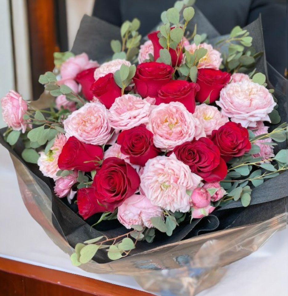 Acaptivating blend of vibrant red roses and delicate, soft pink garden roses. Accented by lush greenery, including eucalyptus, creating a harmonious and visually striking display. A truly impressive gift or a beautiful addition to any space.
